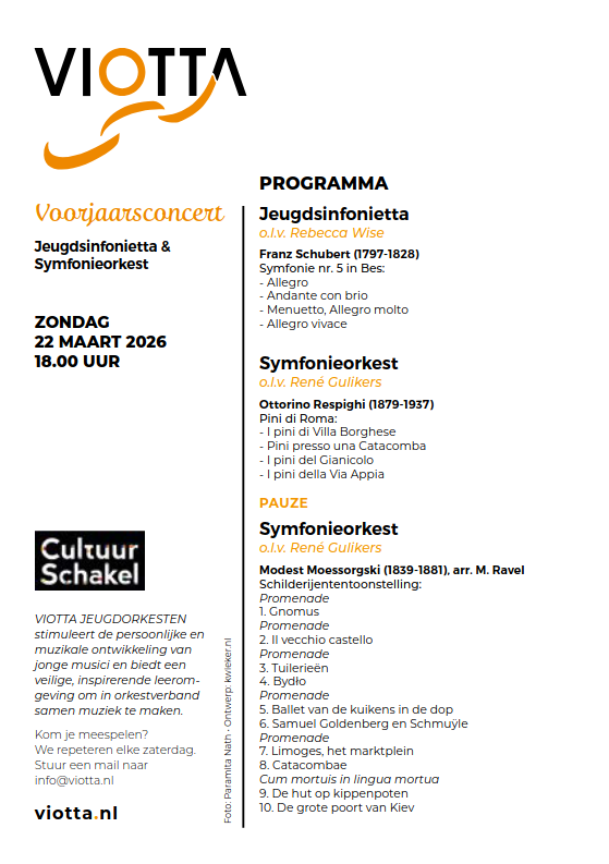 Na de pauze speelt het Symfonieorkest de Schilderijententoonstelling van Modest Moessorgski in de bewerking van Maurice Ravel uit 1922. De oorspronkelijke versie is door Moessorgski in 1874 geschreven voor piano, naar aanleiding van een bezoek aan een tentoonstelling van de Russische kunstenaar Viktor Hartmann. Tien schilderijen zijn door Moessorgski uitgebeeld in muziek en worden afgewisseld door de steeds terugkerende melodie van de promenade. Wandel muzikaal van schilderij naar schilderij en laat je verwonderen!